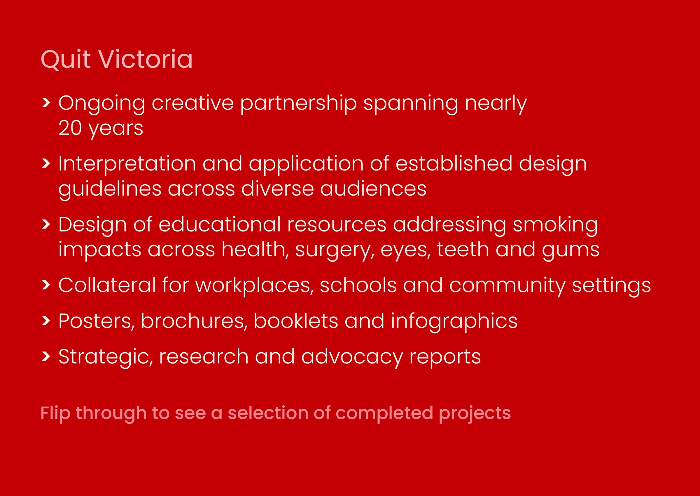 Collaborating with clients in health, education, social wellbeing and small business to develop good design that can genuinely improve people’s lives and build stronger communities.